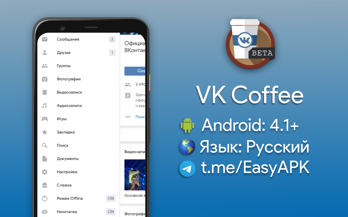 VK Coffee — самая крутая модификация официального клиента ВКонтакте. Нечиталка, прокси, обход музыки и многое другое. #apps @EasyAPK
