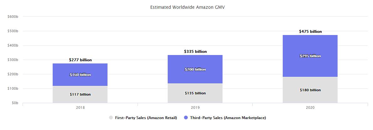 Marketplace pulse проанализировал результаты крупных американских маркетплейсов за 2020 год. В центре внимания, разумеется, оказался Amazon. Вот некоторые результаты, которые приводит издание. В 2020 году селлеры продали на площадке товаров на сумму более $295 млрд (рост на $95 млрд год к году), выручка самого Amazon составила $180 млрд. Таким образом, доля 3P продаж достигла 62% от общей выручки компании, а общий оборот составил $475 млрд. к четвертому кварталу 2020 года доля отправок Prime достигла 85%. Amazon добавил 1,3 млн новых селлеров в 2020 году, из которых лишь 190 тысяч в США.