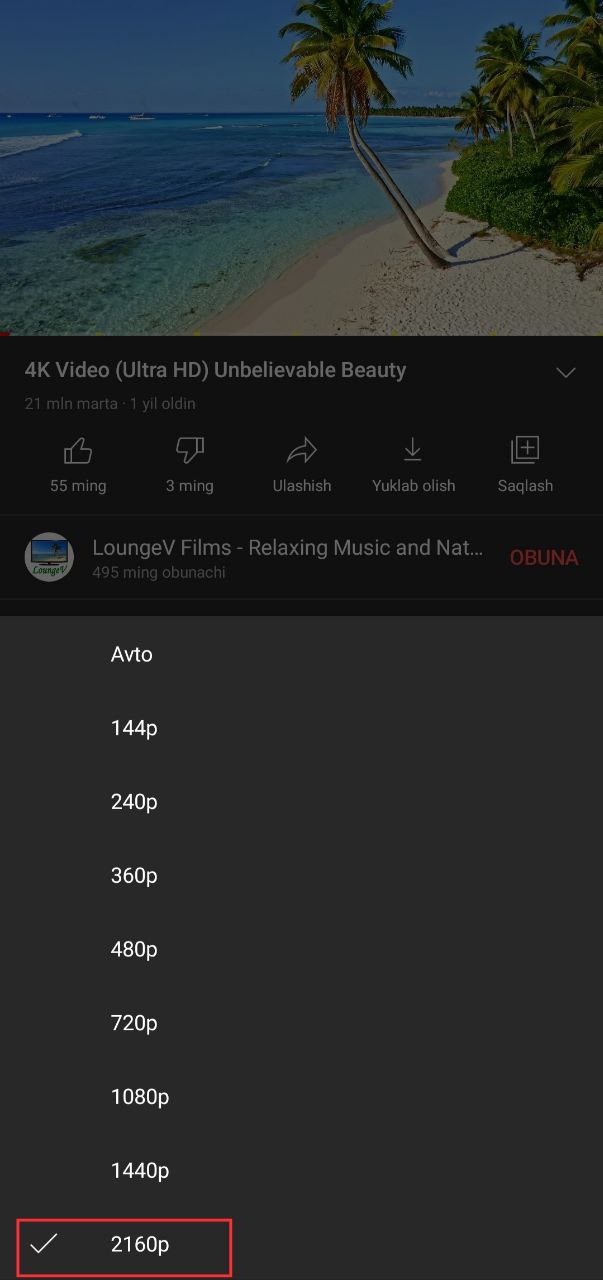 Google nihoyat Android foydalanuvchilariga video rezolyutsiyasini tanlash erkinligini berdi. 2K, 1080p va 720p ekranli smartfonlar endi 4K ni tomosha qilishlari mumkin. iPhone ilovasiga ushbu yuqori sifatli qo‘llab-quvvatlash o‘tgan yilning kuzida iOS 14 chiqarilishi bilan qo‘shilgan edi.