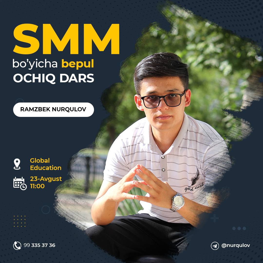🔥 Agar sizga SMM oʻzi nimaligidan boshlab, u orqali oylik topiladigan daromadgacha boʻlgan ma’lumotlar qiziq boʻlsa, sizni 23-avgust, soat 11:00 da, Global Education asosiy markazida, SMM mutaxassisi Ramzbek Nurqulov tomonidan oʻtkaziladigan bepul ochiq darsimizda kutib qolamiz.