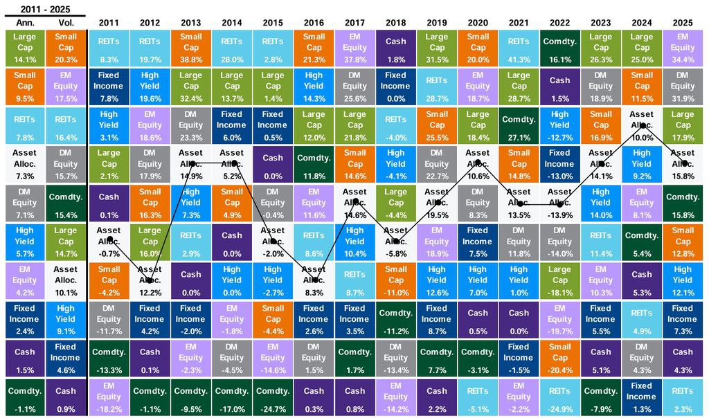 Интересен тот факт, что DM Equity (серый) – Индекс MSCI EAFE, демонстрирующий доходность акций компаний аж 21 развитых стран за пределами США и Канады, в 2023 году был на втором месте с ростом в 18,9%. По итогам 2024 года он также занял второе место - правда, уже с конца, показав всего 4,3%. А в прошлом году снова вернулся на 2 место с внушительной доходностью в 31,9%!