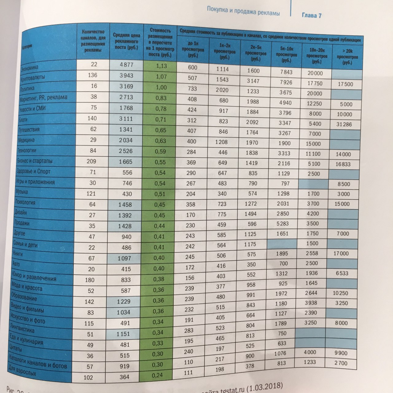 Бонусом ниже публикую фрагмент из книги Артема Сенаторова «Telegram. Как запустить канал, привлечь подписчиков и заработать на контенте» с таблицей со средней стоимостю рекламы в ТГ-каналах, исходя из тематики и числа подписчиков.