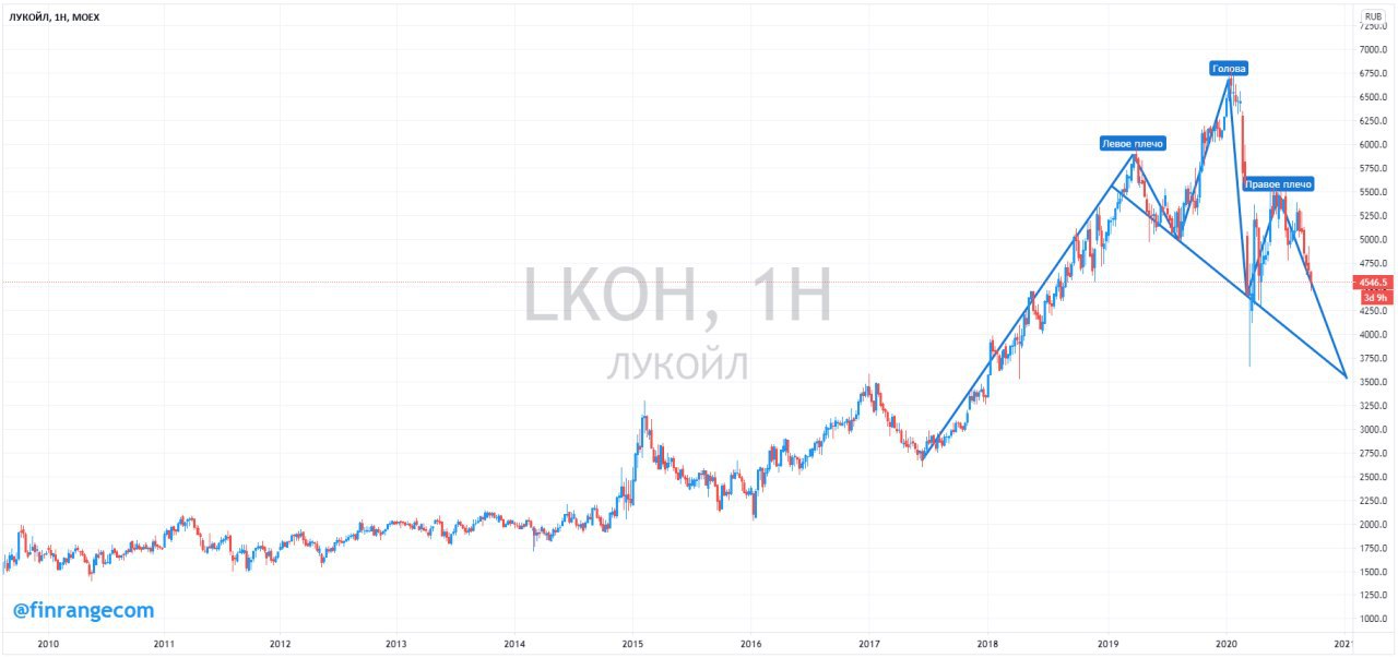 Все знают, что мы используем технический анализ, лишь как вспомогательный инструмент к фундаментальному! Но такую классическую фигуру, как "Голова и плечи" на недельном графике Лукойла после длительного восходящего тренда, мы пропустить не смогли - всё, как по учебнику) #LKOH
