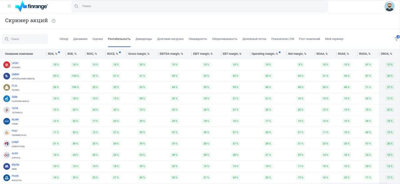 Мы сегодня с помощью нашего скринера акций отфильтровали среди российских акций самые рентабельные компании по нескольким коэффициентам: