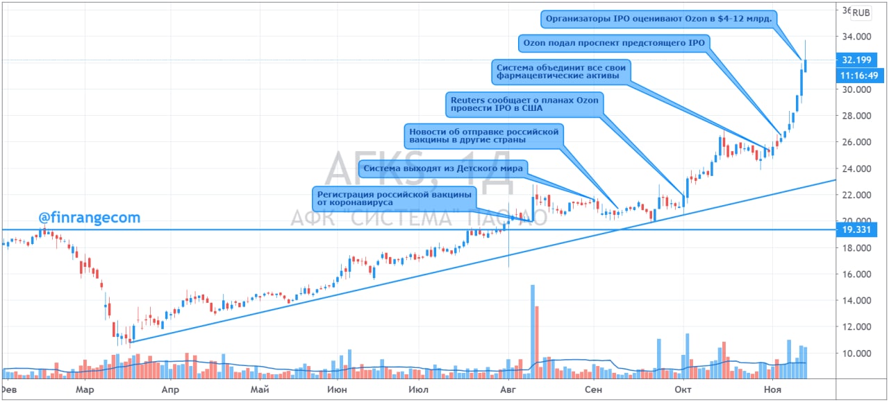Акции Системы достигли цен 2014 г. на новостях об оценке Ozon. Организаторы IPO оценивают Ozon в $4-12 млрд. Онлайн-ритейлер сообщил, что хочет привлечь от IPO порядка $750 млн, ранее были заявлены цифры около $500 млн. Средства от размещения будут направлены на развитие компании.