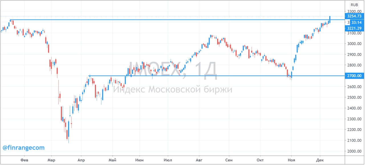 Индекс Московской биржи обновил новые исторические максимумы на фоне роста цен на нефть и оптимизма в отношении вакцины от коронавируса. Основным локомотивом, которые двигали рынок в последнее время, были акции голубых фишек, в частности акции ММК, Сбербанка, Магнита, НЛМК, Северстали.