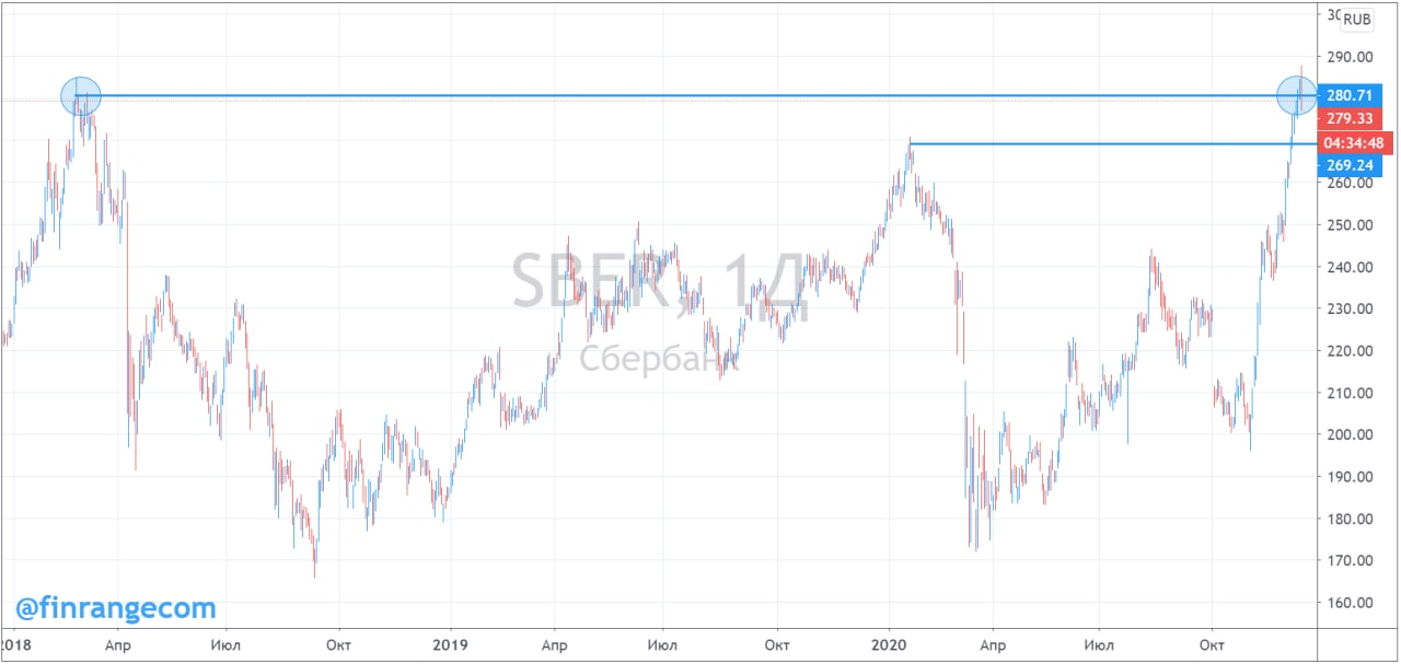 Сегодня акции Сбербанка на фоне общего оптимизма в отношении вакцины от коронавируса и роста цен на нефть преодолели уровень сопротивления и обновили новый исторический максимум. Котировки Газпрома росли более чем на 3% вслед за отскоком цен на природный газ, но не один из тяжеловесов российского рынка не смог удержаться, и перед закрытием основной торговой сессии акции компаний ушли в отрицательную зону.