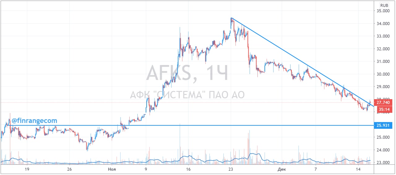 После IPO Ozon, акции Системы с исторических максимумов скорректировались на 20%. Ранее мы в разборе финансовой отчётности за III кв. 2020 г. по МСФО писали, что ждали снижения котировок в диапазон 26-28 руб. И вот, акции компании сегодня пробили этот нисходящий локальный тренд, после чего, мы приняли решение о начале набора длиной позиции.