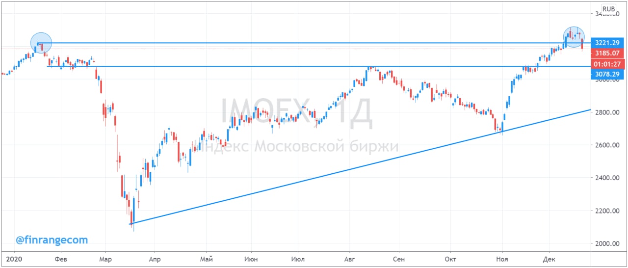 Теперь после текущих панических распродаж на финансовых рынках, когда падает практически всё, мы решили увеличить шорт по российскому рынку. Кроме этого, с технической точки зрения, индекс обновил новые исторические максимумы, но не смог закрепиться и сформировал ложный пробой.