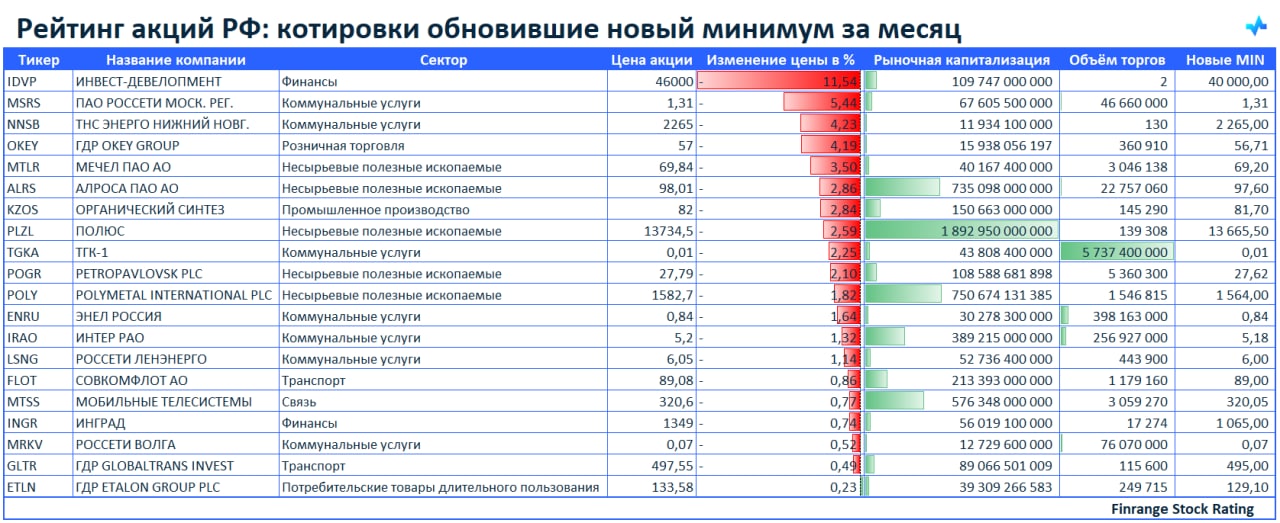 📉Рейтинг акций РФ: котировки обновившие новый минимум за месяц🇷🇺