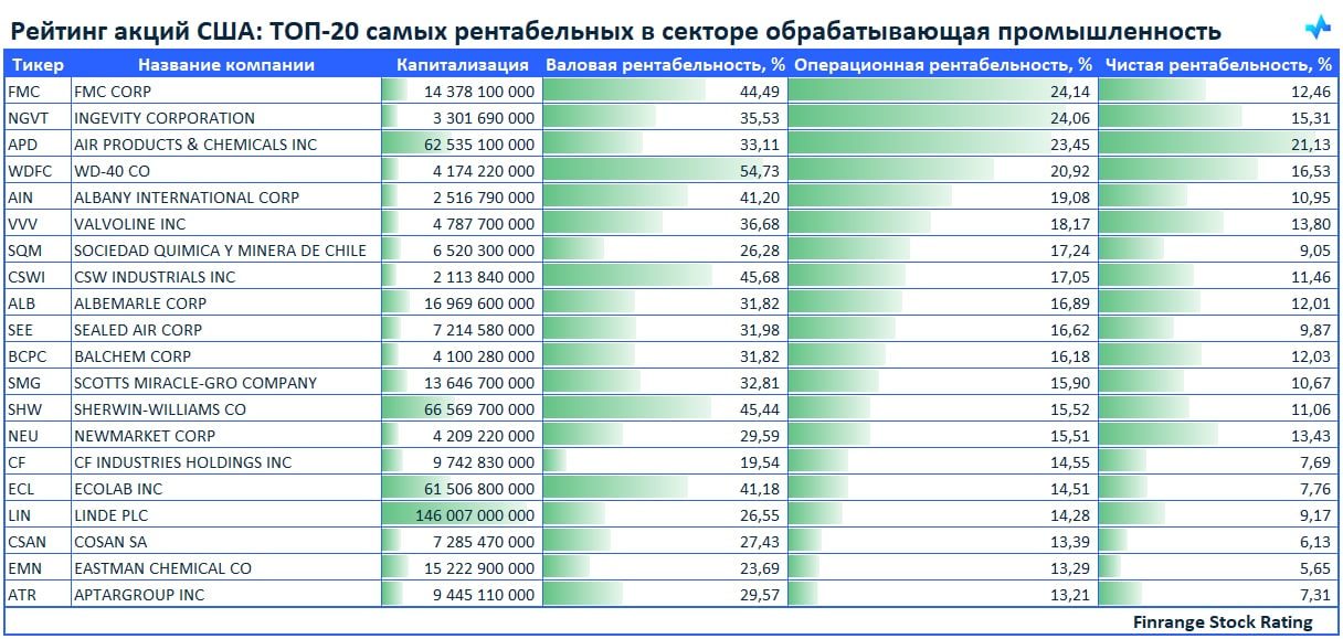 💪Рейтинг акций США: ТОП-20 самых рентабельных в секторе обрабатывающая промышленность🇺🇸