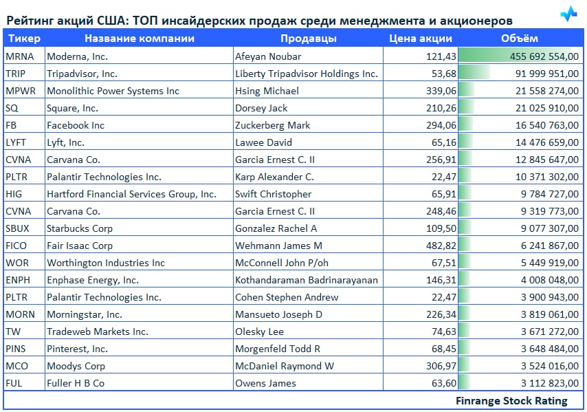 Представляем вашему вниманию свежую информацию по инсайдерским продажам среди менеджмента компаний и крупных акционеров. В этот раз больше всего продаж наблюдалось в акциях Moderna Inc #MRNA.