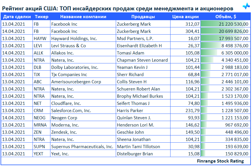 Представляем вашему вниманию свежую информацию по инсайдерским продажам среди менеджмента компаний и крупных акционеров. В этот раз больше всего продаж наблюдалось в акциях Facebook Inc #FB.