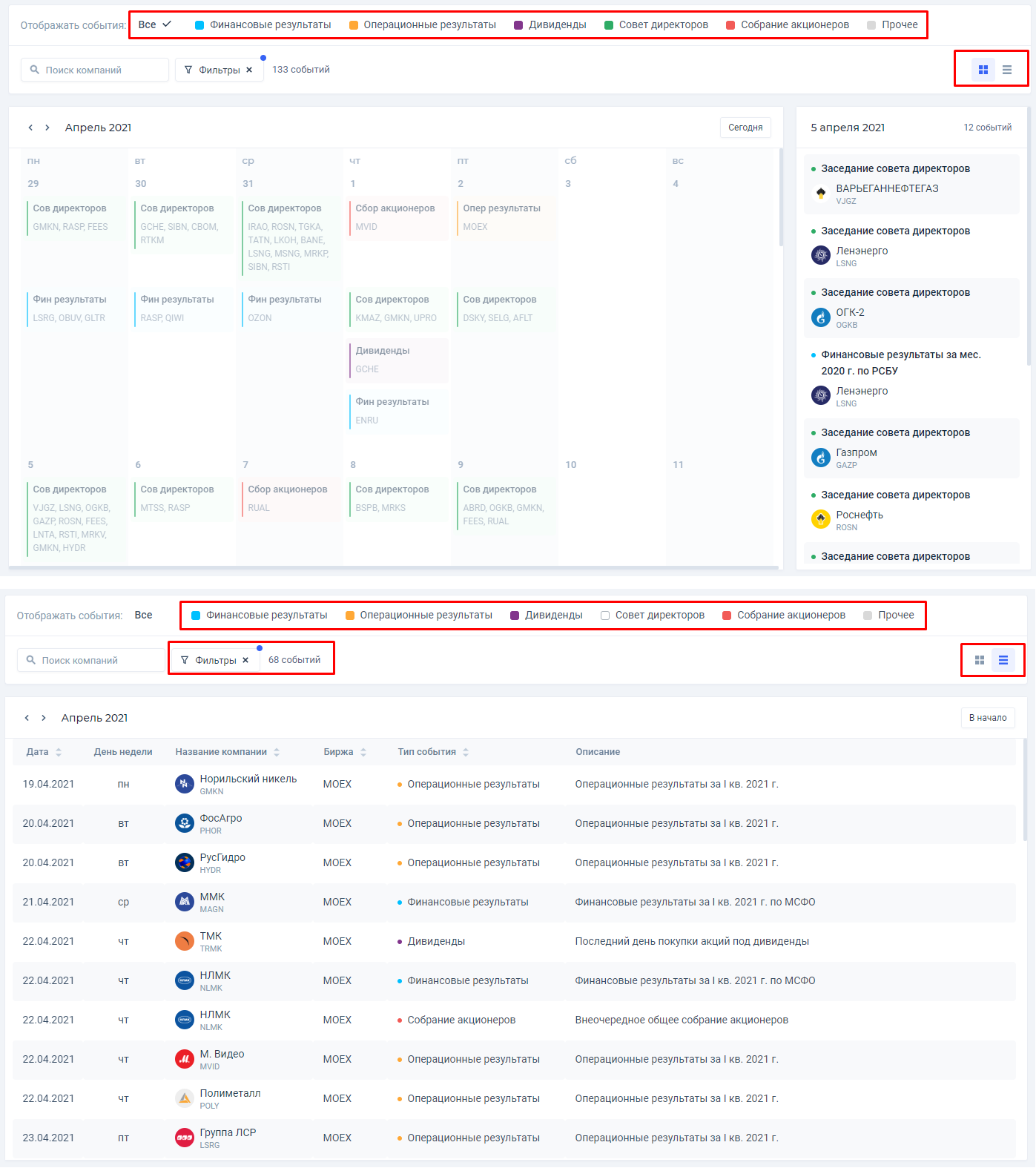 Отслеживать предстоящие и прошедшие события, которые могут повлиять на движение акций. Для более удобного использования мы сделали для вас фильтрацию по корпоративным событиям, компаниям, биржам, секторам и отраслям.