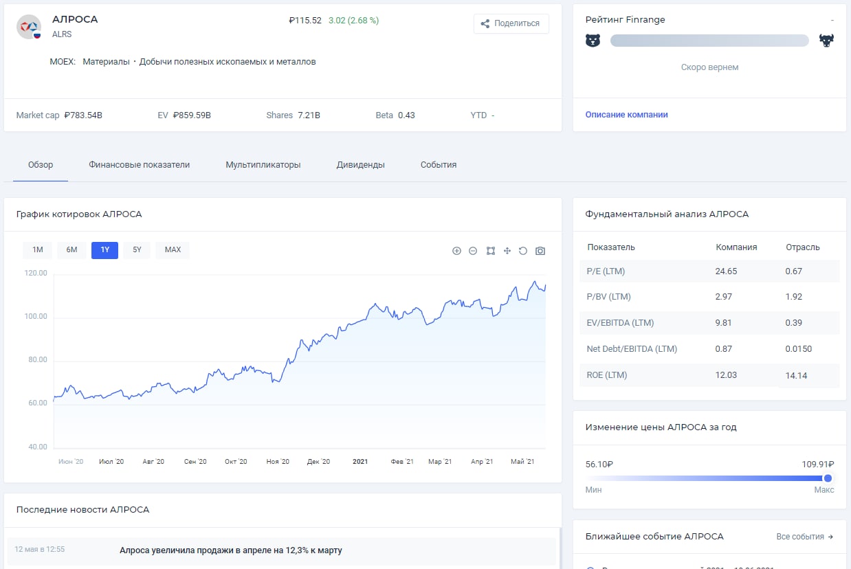 Напомним, что в мае 2021 г. советом директоров компании рекомендовано произвести выплаты дивидендов по финальным дивидендам за 2020 г. из расчета 10 рублей за акцию. Текущая дивидендная доходность составляет 2,65%. Закрытие реестра под дивиденды состоится 25 июня 2021 г.