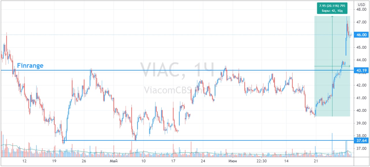 Вчера котировки компании ViacomCBS Inc. выросли на 5% после пробоя торгового диапазона на повышенных объёмах. Кто не успел зайти на пробе, можете дождаться ретеста уровня поддержки в районе $43,19, конечно, если он будет.
