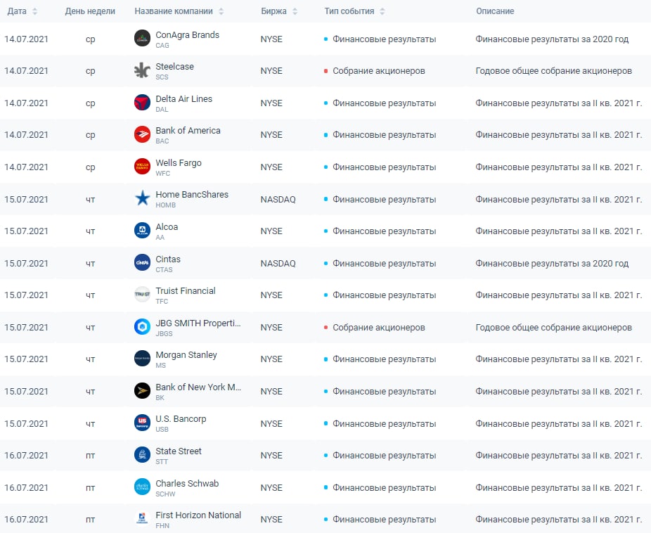 На американском рынке стартовал сезон финансовой отчётности за II кв. 2021 г. В связи с этим, мы расширили календарь инвестора, теперь можно отлеживать предстоящие события по американским акциям.