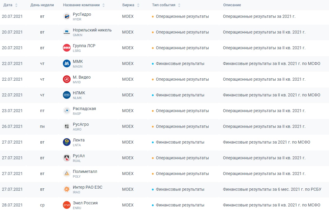 Пока события собираем в полуавтоматическом режиме, из-за этого события пока только до конца июля, но мы как всегда настроены решительно) Хотим, чтобы у вас был бесплатный доступ не только к любой информации по дивидендам российских и американских акций, но и по остальным корпоративным событиям. Сейчас у нас все предстоящие корпоративные события, есть по всем российским акциям.