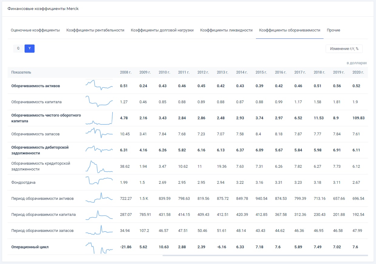 Для расчёта коэффициента оборачиваемости запасов возьмём итоговые финансовые результаты Merck за 2020 г. в долларах.