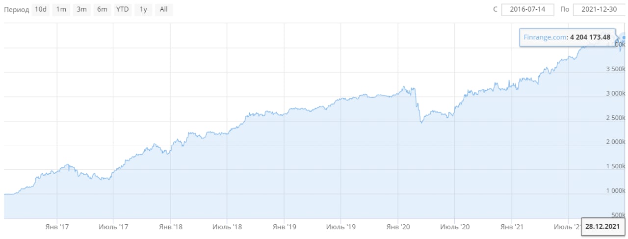 Сбер торгуется на ниже одного капитала, а это соответствует цене за акцию примерно в 250 руб. Если купить привилегированные акции банка ниже уровня балансовой стоимости, средняя годовая доходность за год на период ближайших 4 лет составит с учётом реинвестирования дивидендов 27,44%. Что это означает в рублях? Если сейчас купить на 1 000 000 руб. в течение рассматриваемого периода мы получим 2 637 989,63 руб.