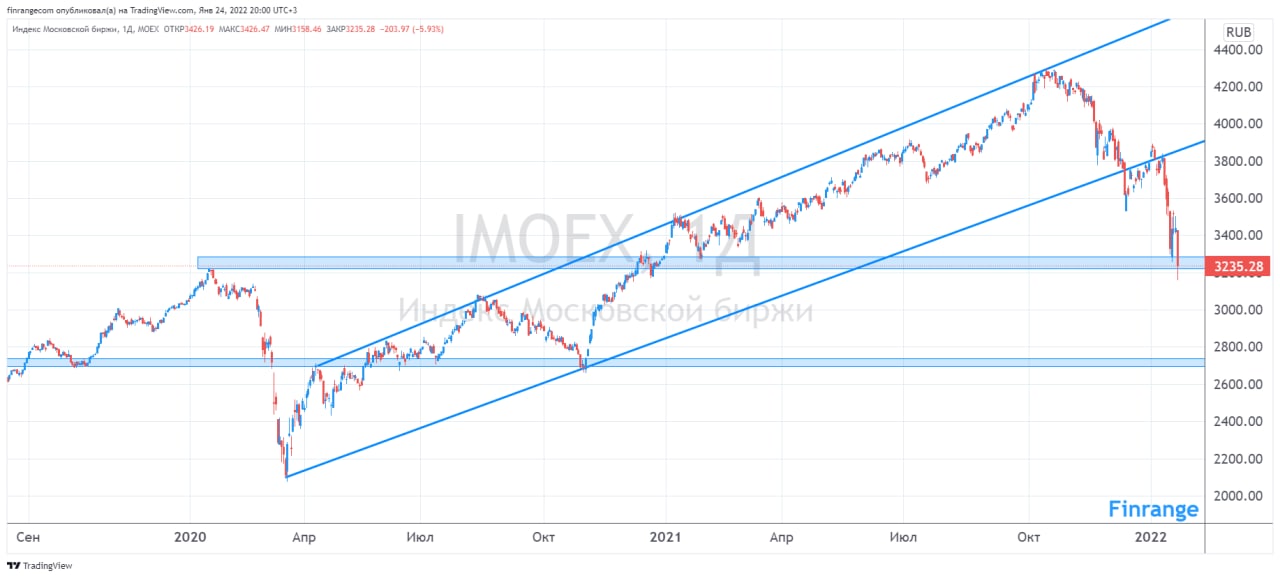 Посмотрим, как будут развиваться события дальше. Ждём ответа со стороны запада по гарантиям безопасности России. Технически, индекс МосБиржи удержался на уровне поддержки в районе 3250 пунктов, но шансы его сломать высоки.