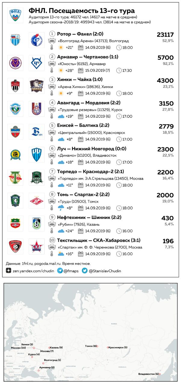 Ну и по традиции пару слов про предыдущий тур. В нем наши сегодняшние соперники собрали 4 200 человек с двух своих домашних матчей, а больше всех собрал, разумеется, "Ротор": на игру с "Факелом" пришло 23 117 зрителей. Максимально полный обзор по ссылке, а инфографика ниже.