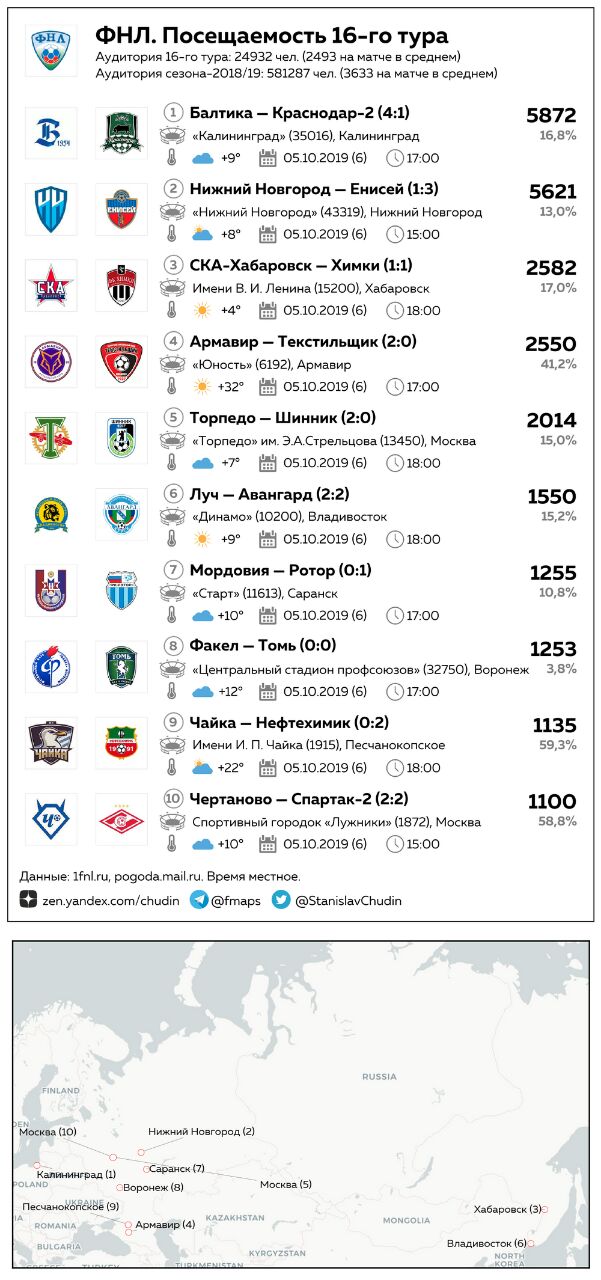 Посещаемость ПФЛ на прошедших выходных. Чуть более 20 тысяч зрителей на 31 матче, печально.
