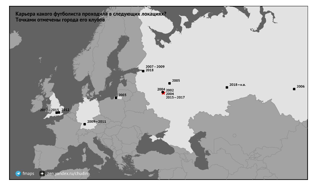 Принцип задания прежний: ниже на карте изображены локации, в которых располагаются футбольные клубы, где играл загаданный футболист. Периоды годов рядом с — время проведения карьеры игроком в клубах этого города.