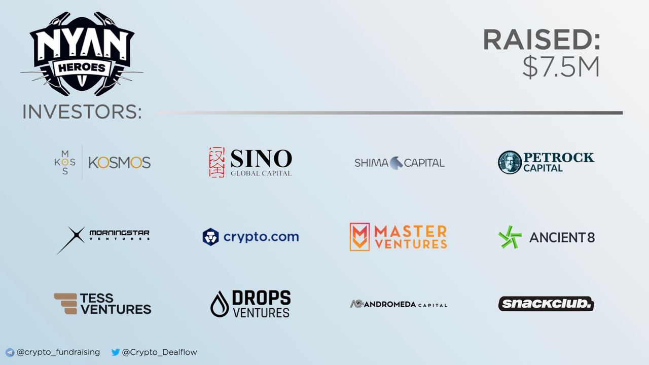 #AntonSquad Solana-based P2E game Nyan Heroes has closed $7.5M strategic round at $100M valuation. Kosmos Ventures, Sino Global Capital, Shima Capital, Petrock Capital, Morningstar Ventures, 32-bit Ventures, CryptoCom, Tess Ventures, Master Ventures, Wave7…