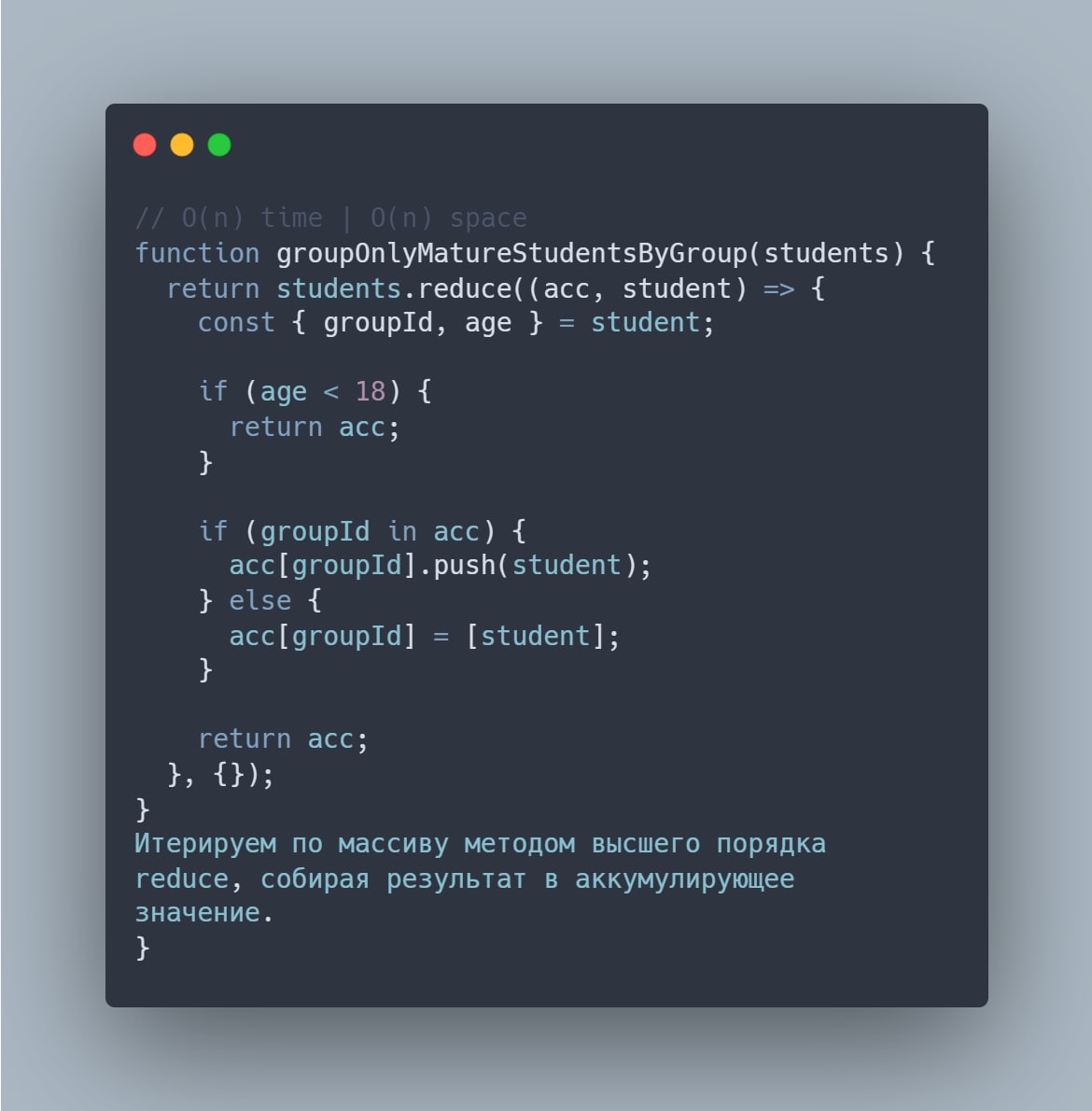 Напишите функцию, которая на вход принимает массив из студентов, где студент — это объект с полями «имя», «возраст» и «номер группы» {name: string, age: number, groupId: number}, а на выходе возвращает объект, где ключ — это номер группы, а значение — массив из студентов старше 17 лет.