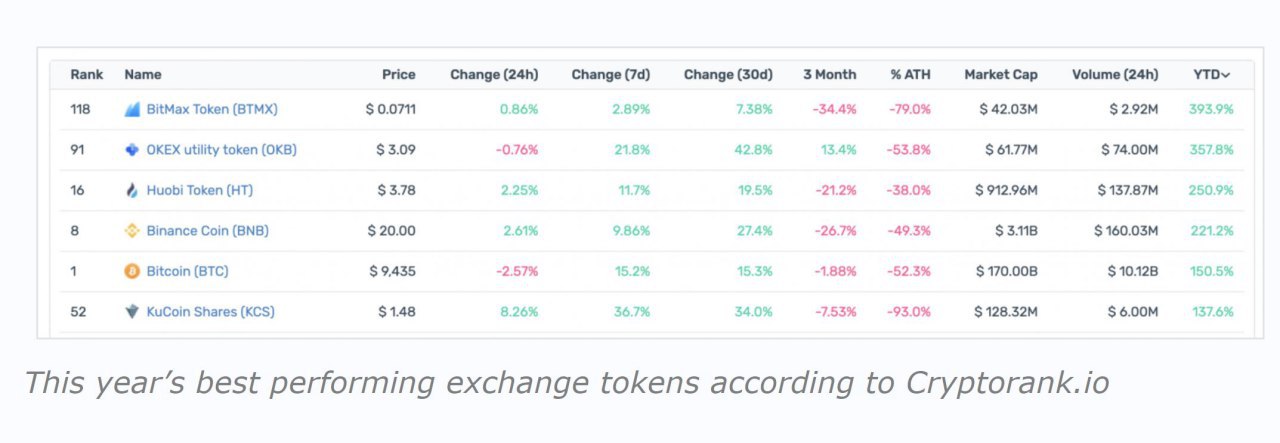 Кроме биржевых токенов. Именно биржевые токены обслуживают биржевые обороты и служат средством уменьшения комиссий для трейдеров. И в этом их польза. В этом году токены основных крупных бирж принесли их держателям больше прибыли, чем биктоин. 2019 год стал годом биржевых токенов.