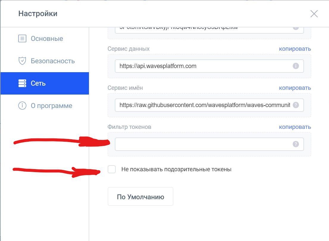 Далее нажимаете на символ кружочек в правом верхнем углу. Идете в закладку Настройки, Сеть, удаляете текст в строке фильтр токенов. Чуть ниже снимаете галочку в пункте не показывать подозрительные токены. Это обязательно, иначе вы не увидите токен.