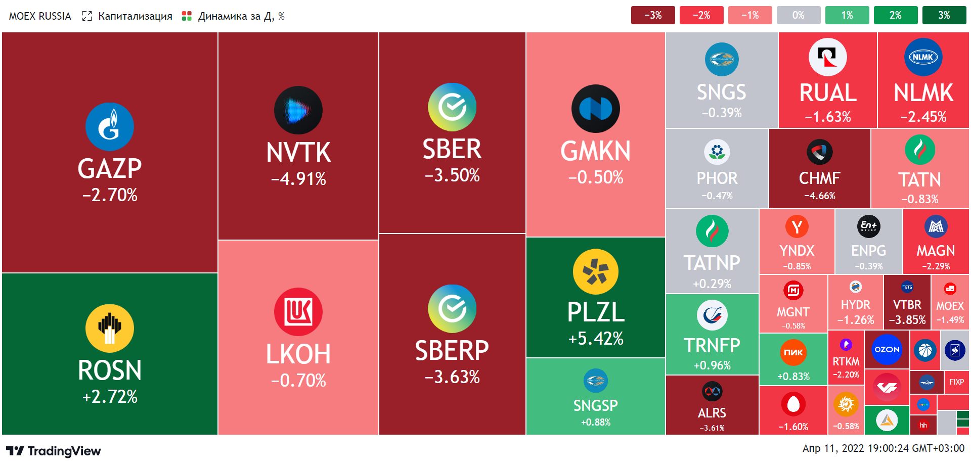 Российский фондовый рынок в понедельник снижается, индекс МосБиржи к 17:00 опустился на 1%. Американские индексы в начале сессии также показывают умеренно негативную динамику перед публикацией данных по инфляции в США за март (завтра, в 15:30 мск) и перед началом сезона отчётностей на этой неделе.
