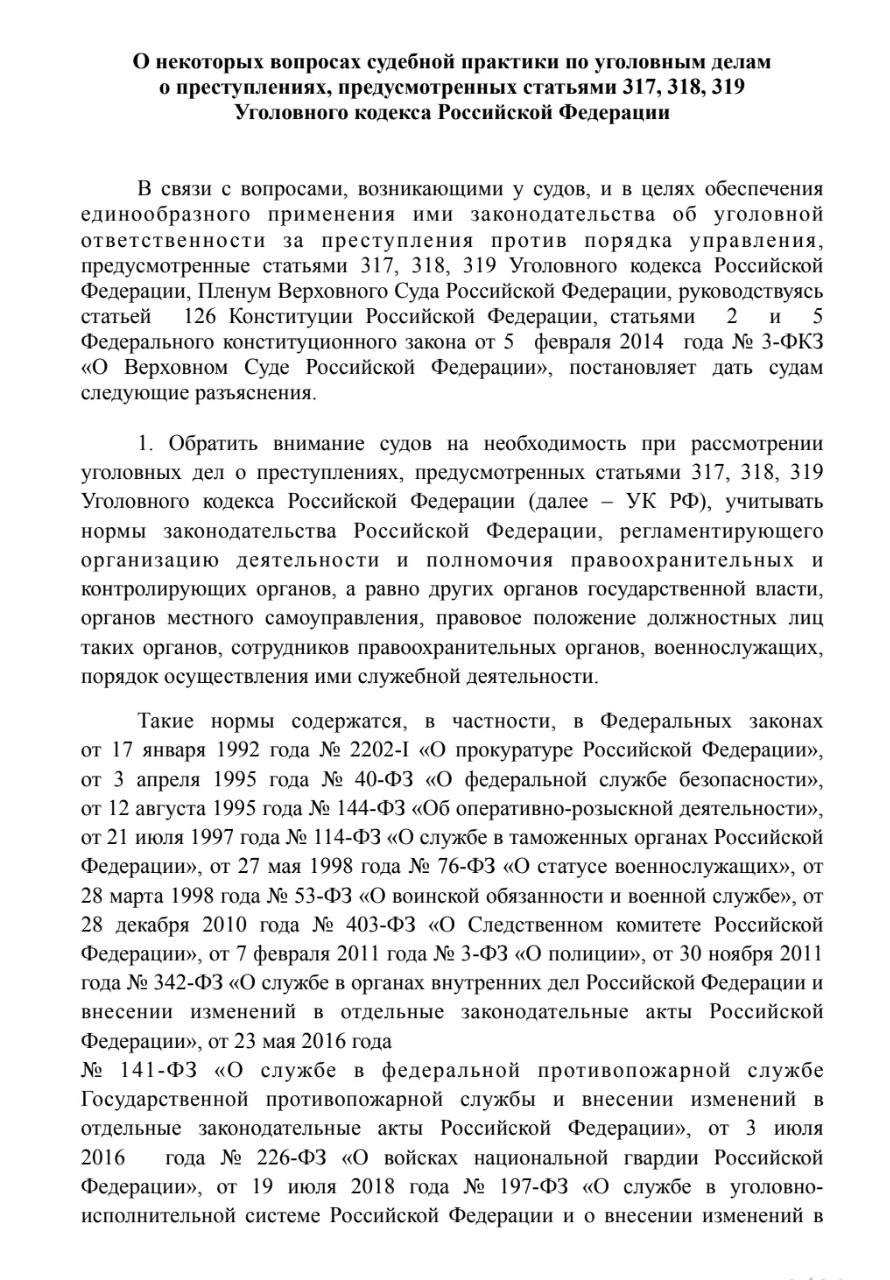 Верховный суд подготовил проект постановления о вопросах судебной практики по статьям УК РФ: ст. 317 «Посягательство на жизнь сотрудника правоохранительного органа», ст. 318 «Применение насилия в отношении представителя власти», ст. 319 «Оскорбление представителя власти».