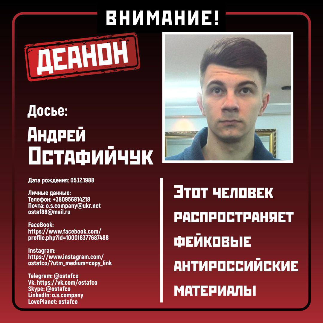 Сегодня мы хотим познакомить вас с еще одним активистом сообщества «Таргеториум». Он принимал активное участие в пропагандистской кампании со вбрасыванием фейков о специальной военной операции ВС РФ. Познакомьтесь с фотографом Андреем Остафийчуком, родившимся в 1988 году.