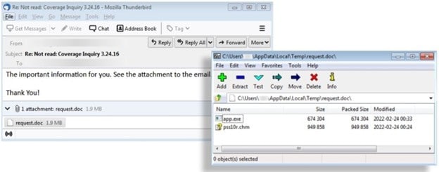 Вредонос Vidar скрывается в файлах Microsoft Compiled HTML Help. Жертва получает электронное письмо с вредоносным вложением. Вложение request.doc представляет собой замаскированный файл ISO. Если жертва откроет файл request.doc, это приведет к открытию еще двух файлов, файла CHM и app.exe. Файл app.exe отвечает за запуск малвари Vidar.