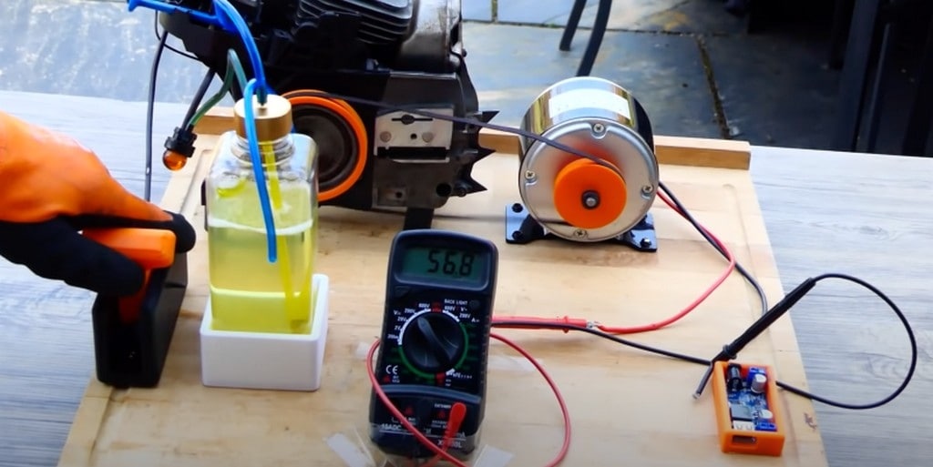 Далее он использовал молекулярное сито, которое поглощало воду, но не этанол. Он прикрепил двигатель и генератор к старой разделочной доске, выполнил точную настройку правого дросселя и воздушной заслонки, но телефон не заряжался. Тогда Сэм увеличил обороты двигателя, но регулятор заряда взорвался. Оказалось, что мультиметр был расположен неправильно и выдавал отрицательное напряжение. С заменой платы телефон зарядился. Сэм заявил, что он наблюдал показатель более 50 вольт.