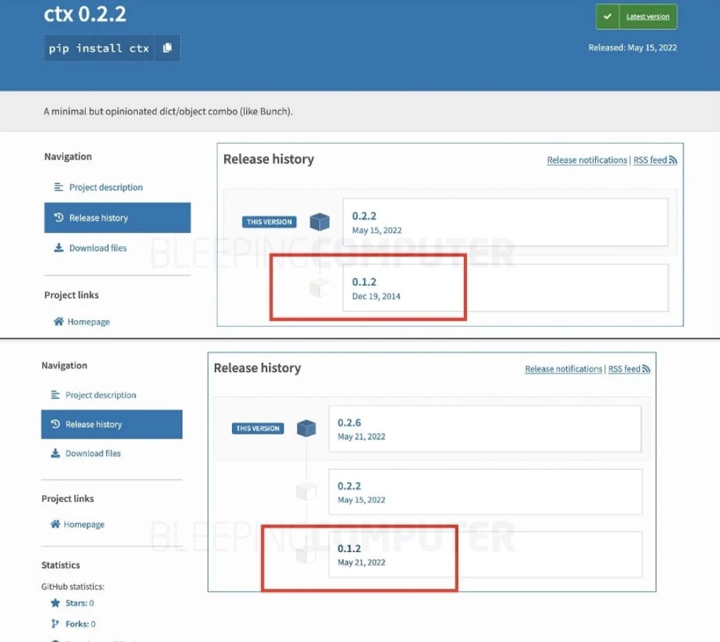 Атаке подверглись две библиотеки, но только одна из них могла нанести серьезный ущерб. У библиотеки ctx было 22 000 загрузок в неделю. Последнее обновление для неё было загружено на PyPI в декабре 2014 года. Получив контроль над библиотекой, злоумышленники загрузили свои версии – 0.1.2 (последнюю версию оригинала), 0.2.2 и 0.2.6, включающие в себя функционал для кражи и передачи данных на серверы хакеров.