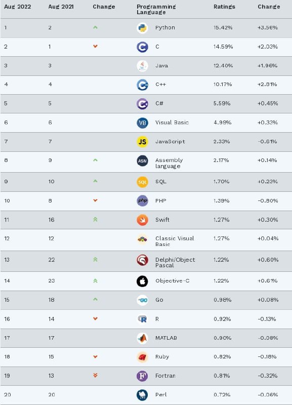Из изменений за год также отмечается рост популярности языков Assembly (поднялся с 9 на 8 место), SQL (с 10 на 9), Swift (с 16 на 11), Go (с 18 на 15), Object Pascal (с 22 на 13), Objective-C (с 23 на 14), Rust (с 26 на 22). Снизилась популярность языков PHP (с 8 на 10), R (с 14 на 16), Ruby (с 15 на 18), Fortran (с 13 на 19).