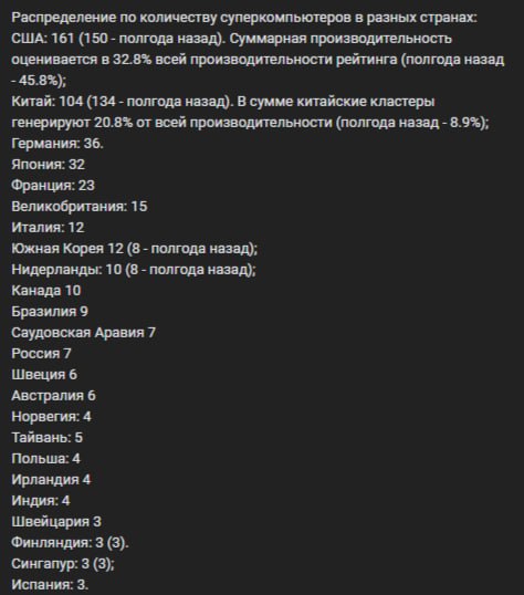 • Китай: 104 (134 - полгода назад). В сумме китайские кластеры генерируют 20.8% от всей производительности (полгода назад - 8.9%);