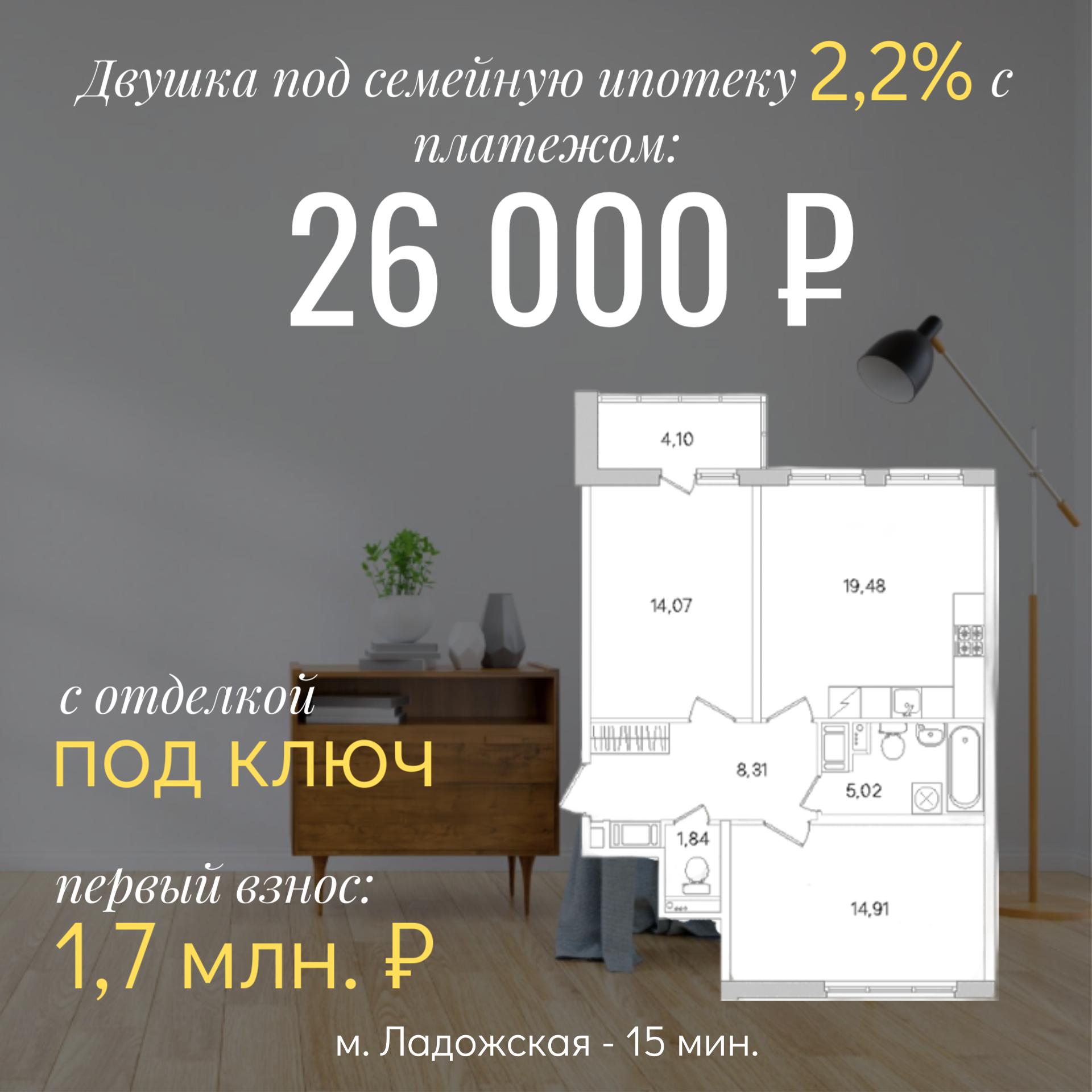 Сейчас такая квартира доступна по ипотеке 2,9% для всех с платежом около 31 000 ₽ в месяц при первом взносе 1,8 млн ₽ .