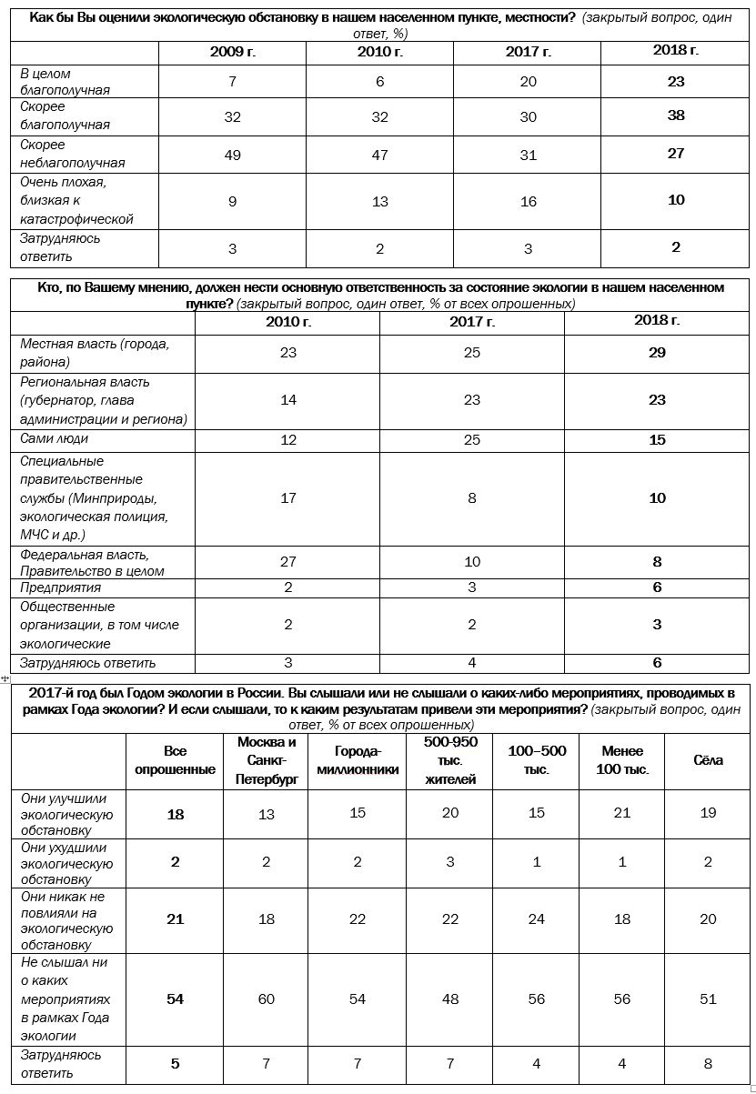 За последнее десятилетие оценки экологической обстановки среди россиян заметно выросли: если в 2009 г. положительно характеризовали состояние окружающей среды в месте своего проживания менее половины опрошенных 39%, то в августе 2018 г. – уже 61%. Среди наиболее острых экологических проблем респонденты называют загрязнение воздуха заводами (17%), мусорные свалки (15%) и отсутствие очистки рек и озер (10%). Ответственность за состояние экологии сегодня в большей степени россияне возлагают на местные (29%) и региональные (23%) власти. Высока и доля тех (15%), кто осознает значимость роли рядовых граждан в деле сохранения природы.