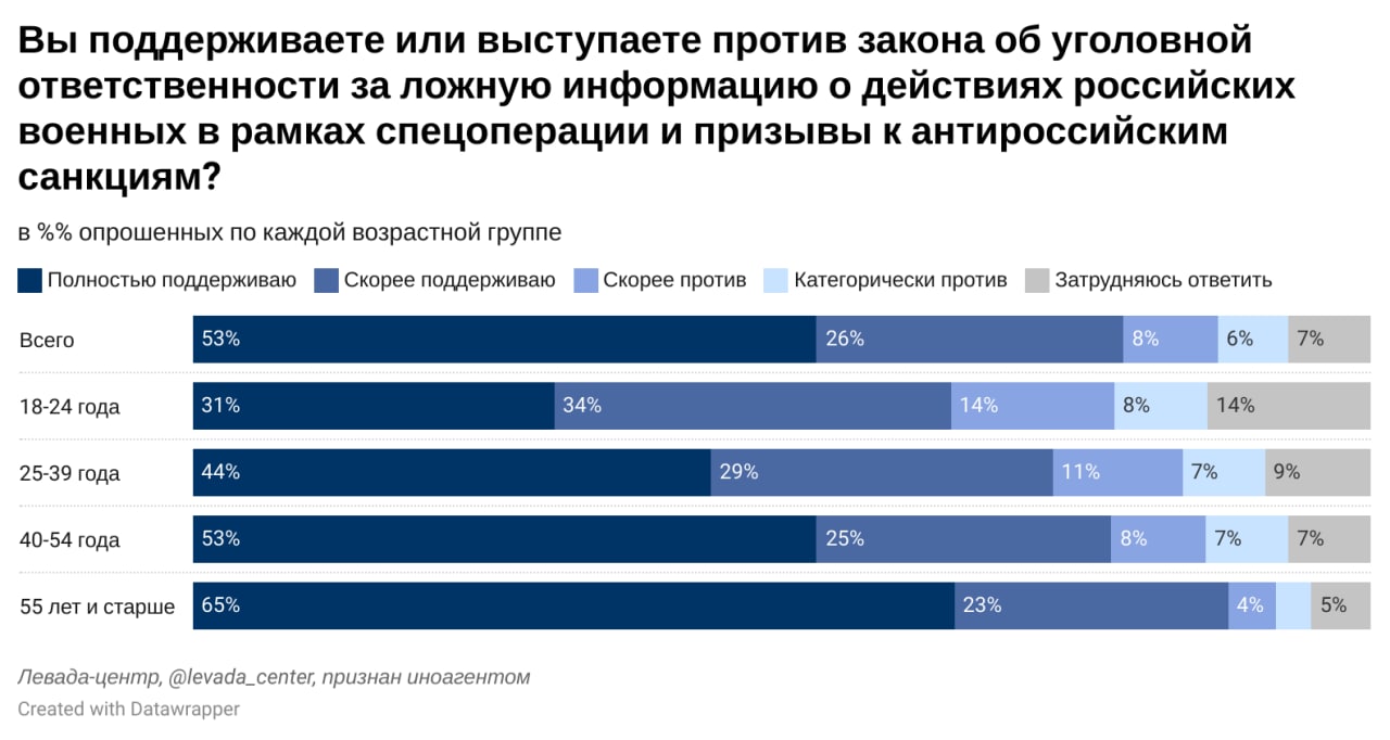 Левада-Центр провел исследование отношения россиян к принятому закону о «фейках» в СМИ, доверии информации в контексте конфликта с Украиной. Формулировки исследования были составлены совместно с интернет-изданием «Спектр». Большинство россиян поддерживает принятие закона об уголовной ответственности за распространение «фейков» (79%), а государственные СМИ остаются источником информации с наибольшим кредитом доверия. В то же время в полной мере государственным источникам информации доверяет 31% опрошенных. Уровень доверия отличается в зависимости от возраста и политических взглядов.