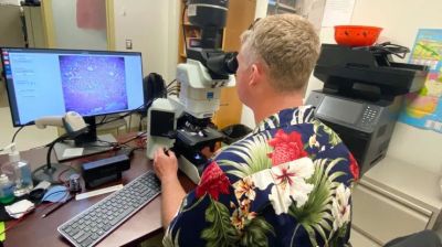 Dr. Niels Olson uses the Augmented Reality Microscope. (Credit: US Department of Defense)