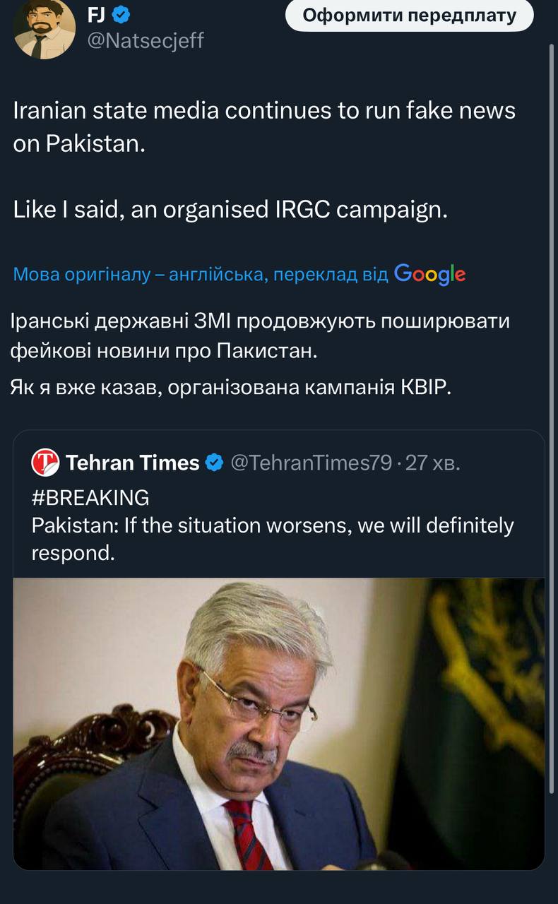 В іншому місці він пише: "Попередні фейкові новини про Пакистан є частиною організованої кампанії КВІР. Міністр оборони Пакистану офіційно спростував ці спроби КВІР втягнути Пакистан у конфлікт".