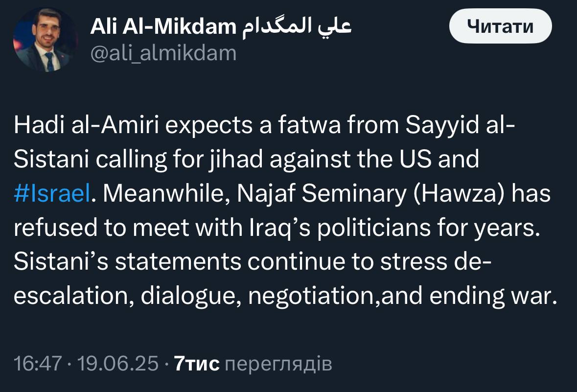 Про-іранські вилупки в Іраку та КВІР намагаються втягнути аль-Сістані в конфлікт, але це просто ще одна «пакистанська ядерка» 🤷♂️