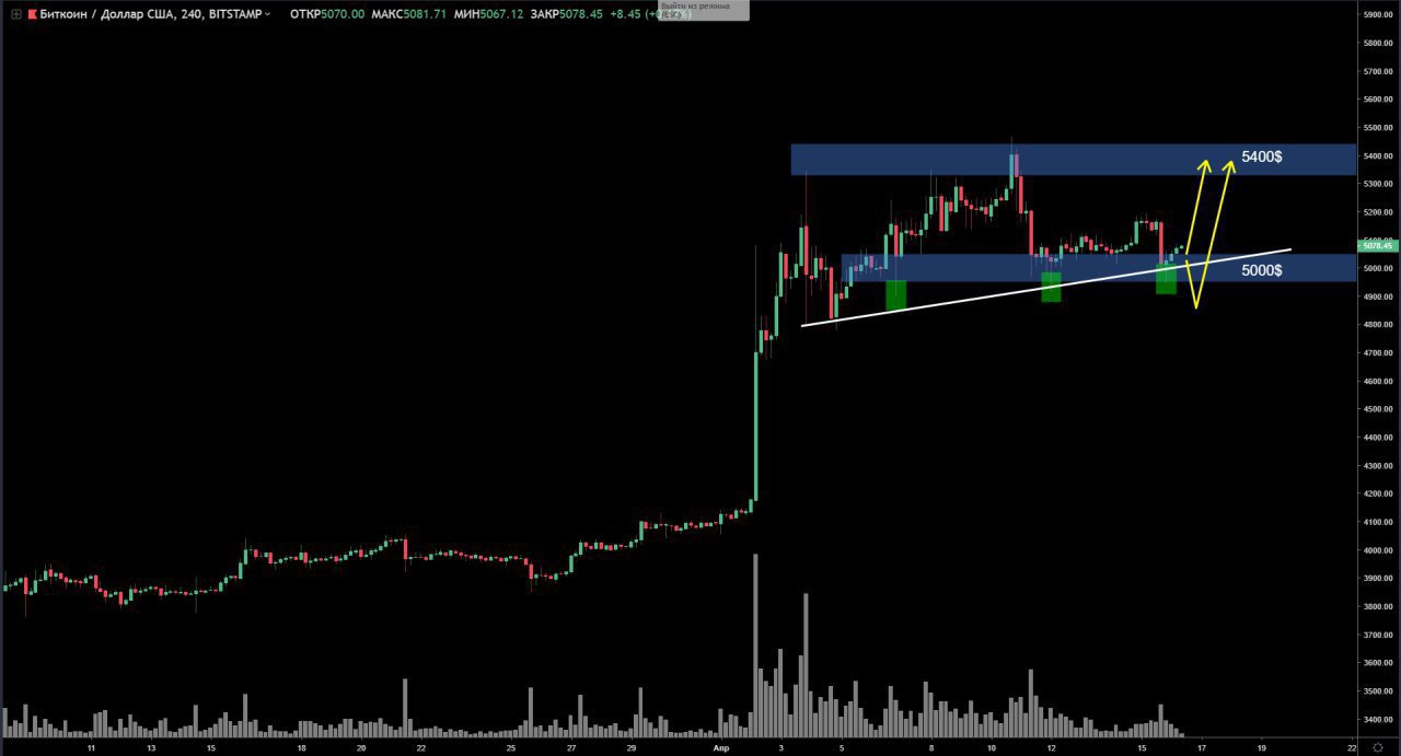 Биткоин после коррекции от сопротивления 5400$, уже 5 дней стоит над поддержкой 5000$. Каждую попытку пробоя поддержки быстро выкупают , что говорит об интересе китов к данному уровню.