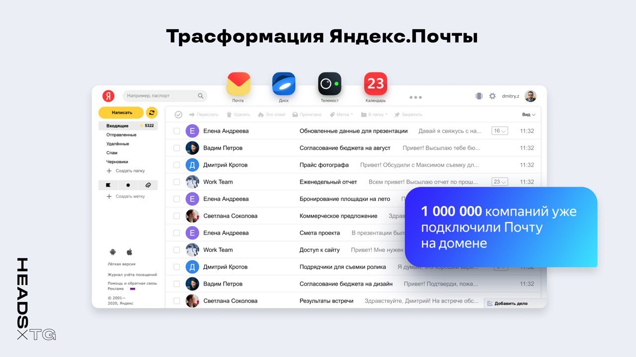 Яндекс трансформировал свою стандартную почту в Почту360. Сейчас в нее входят такие сервисы как Диск, Телемост, Календарь, Мессенджер и Заметки.