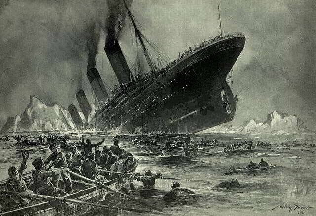В 23:40 14 апреля во время первого рейса самый большой на тот момент океанский лайнер с 2208 людьми на борту по касательной столкнулся с айсбергом и получил серьёзные повреждения обшивки корпуса. Спустя 2 часа 40 минут — в 2:20 15 апреля полностью ушёл под воду. Катастрофа унесла жизни, по разным данным, от 1495 до 1635 человек. До декабря 1987 года, когда потерпел крушение филиппинский паром «Донья Пас», гибель «Титаника» оставалась самой крупной по количеству жертв катастрофой на море в мирное время. Неформально является самой знаменитой катастрофой XX века.