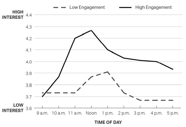 ✅ Даже к концу рабочего дня у сильнововлеченных сотрудников интерес к работе выше, чем у слабововлеченных на пике.